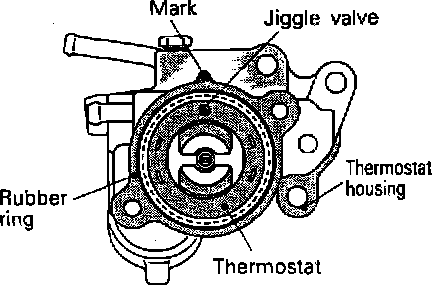 4. Reverse procedure to install, ensuring jiggle valve on thermostat is aligned with mark on thermostat housing.