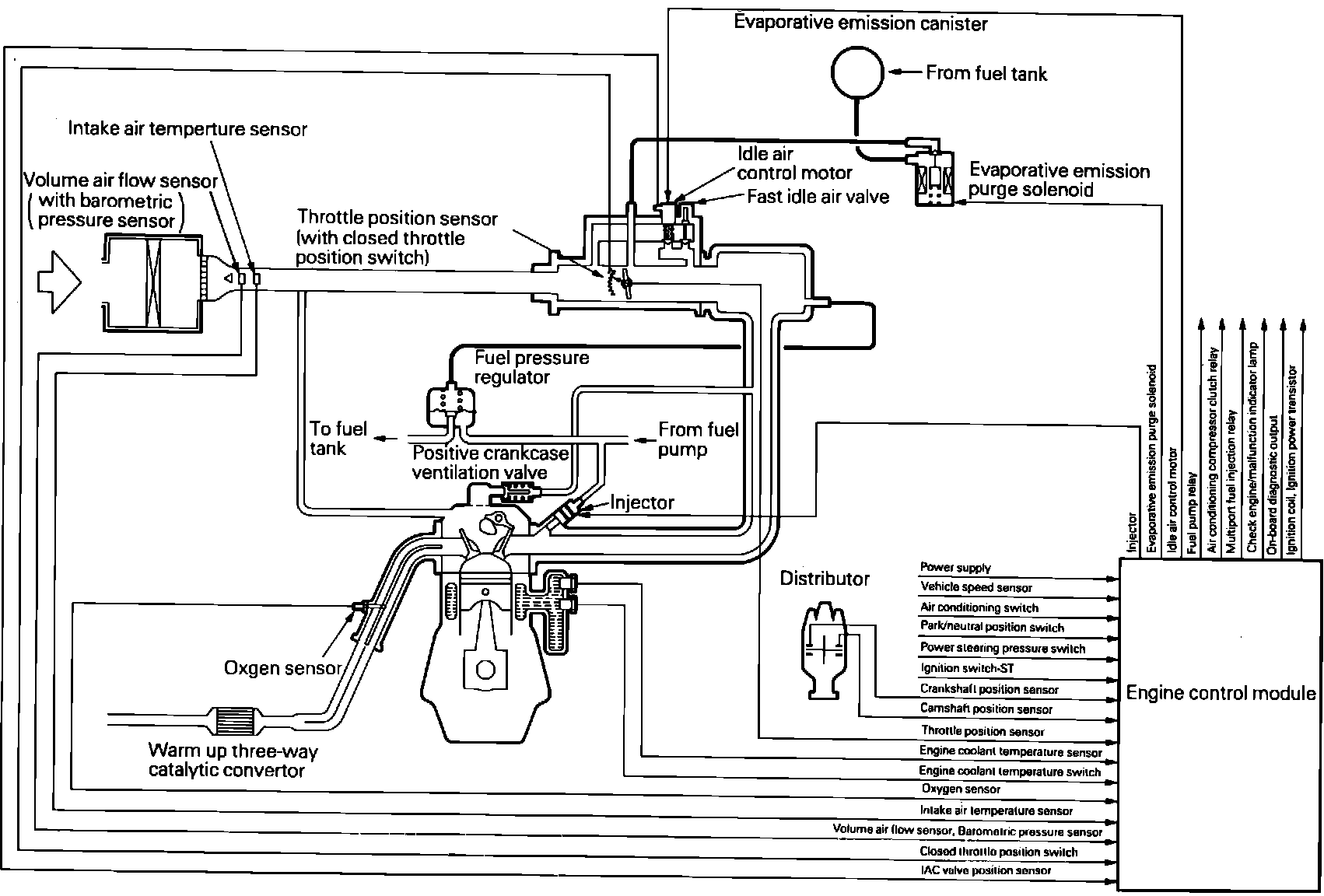 The ECI system is made up of an electronic control module (ECM), various sensors and output devices. This system controls engine operation (i.e. A/F mixture and ignition timing) to reduce pollutants while maintaining optimum driveability conditions and reducing fuel consumption.