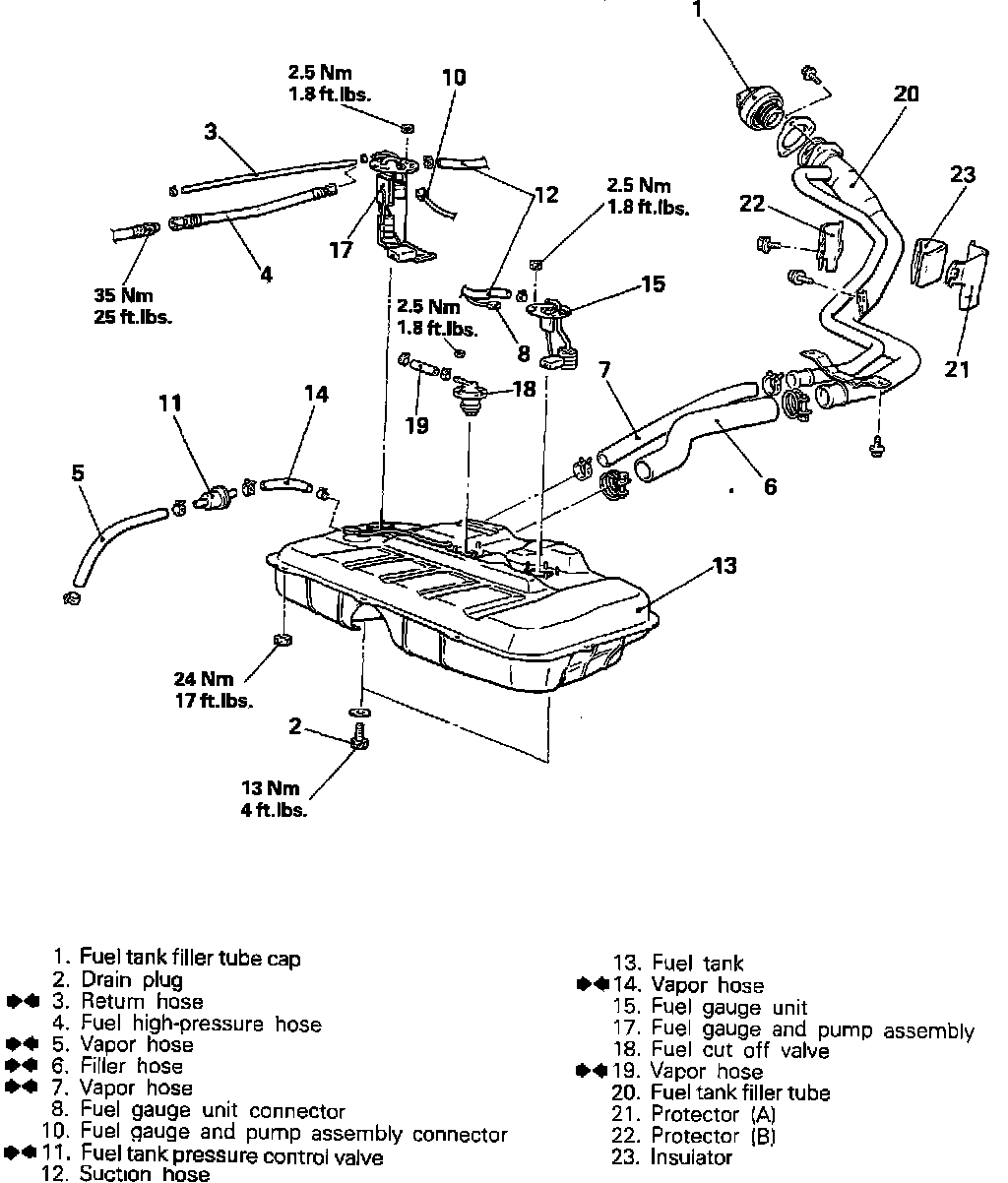 All wheel drive models require the drive shaft be removed prior to fuel tank removal. Refer to Axles, Driveshafts Replacement procedures in TRANSMISSIONS CLUTCHES DIFFERENTIALS AXLES AND DRIVE SHAFTSFuel Tank And Related Parts (AWD):