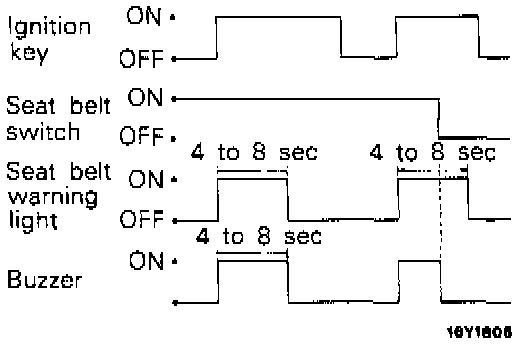When the seat belt switch is ON (seat belts not buckled) with the ignition key in the ON position, the seat belt warning timer causes the seat belt warning light to illuminate and the buzzer to sound for 4 to S seconds. If the seat belt switch is set to OFF (the seat belts buckled) during the seat belt warning timer interval. only the buzzer is canceled.