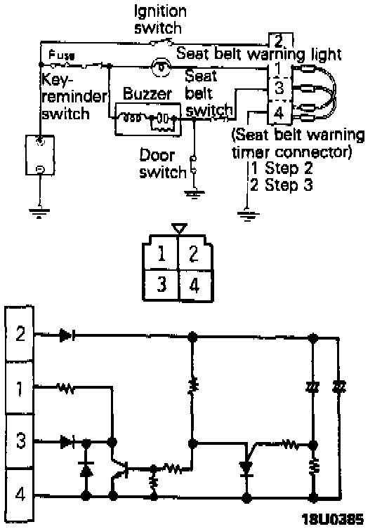 2. When the Y-B wire (terminal 1) and B wire (terminal 4) are connected with a jumper wire, the seat belt warning light should illuminate. If it fails to illuminate, check the bulb, key- reminder switch and fuse.