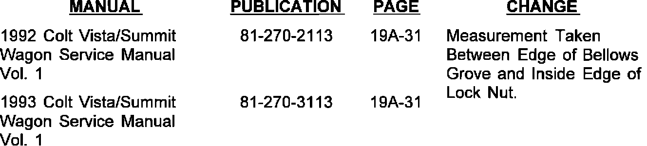 The illustration used in step 3/4 (installation of tie rod end locking nut/tie rod end) shows an incorrect measuring method. The correct method is to check the measurement between the end of insertion groove for the bellows and inside edge of the locking nut. Please insert the corrected pages in the manuals. The corrections are highlighted with **ASTERISKS**.