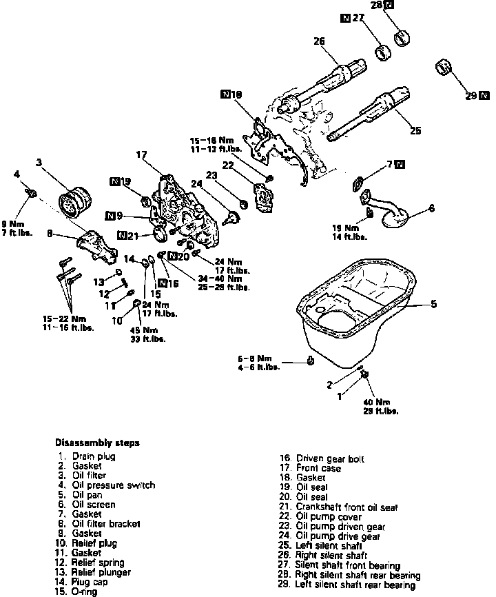 Replace the oil pan, oil pump and silent shafts in numbered sequence shown, noting the following: