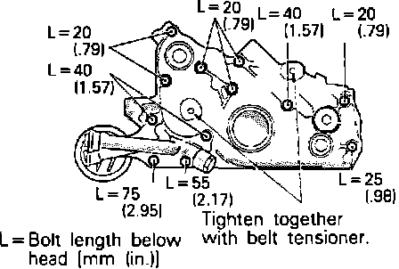 Fig. 61 Front case assembly bolt locations. 2.4L/4-143.5 engine: