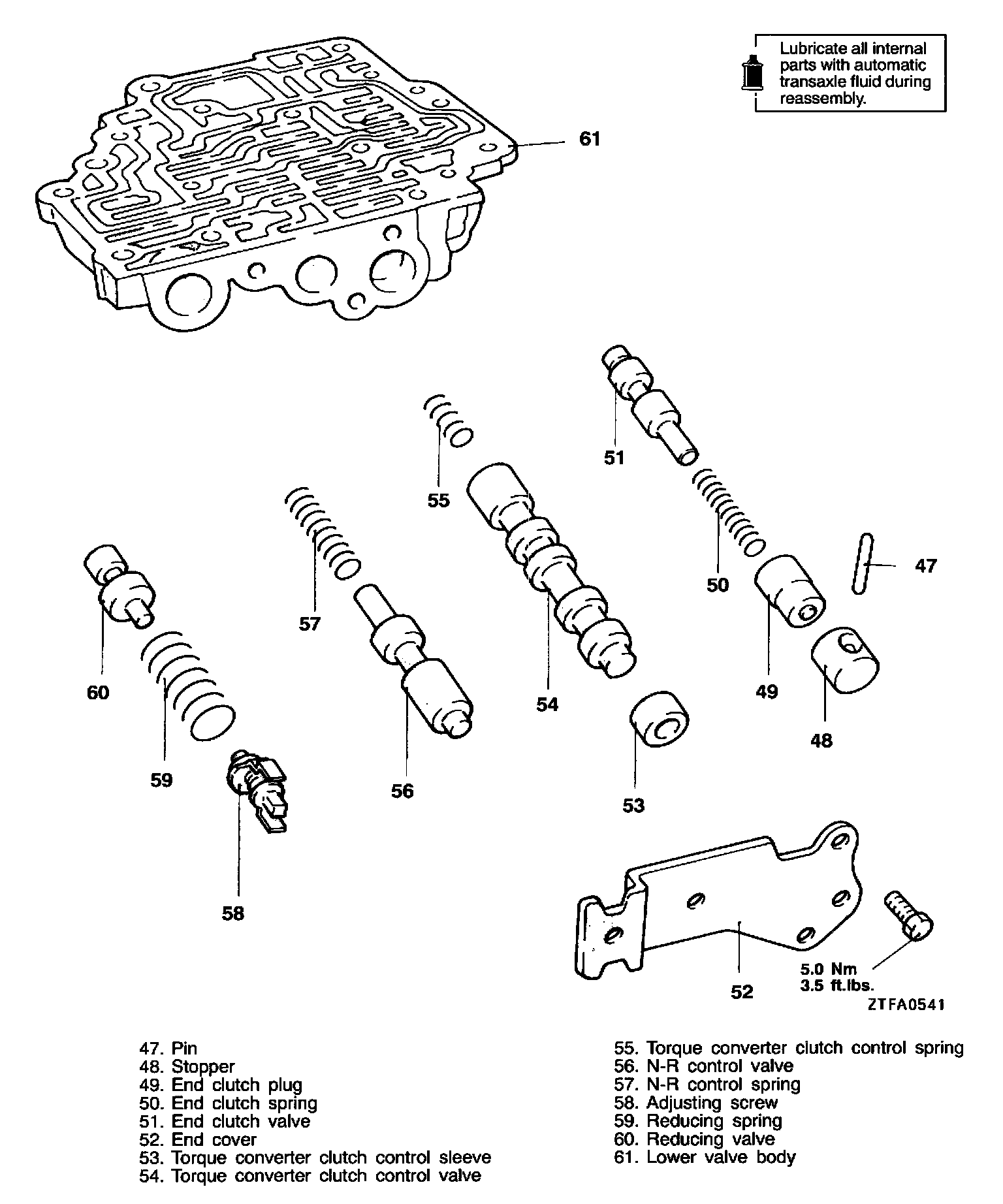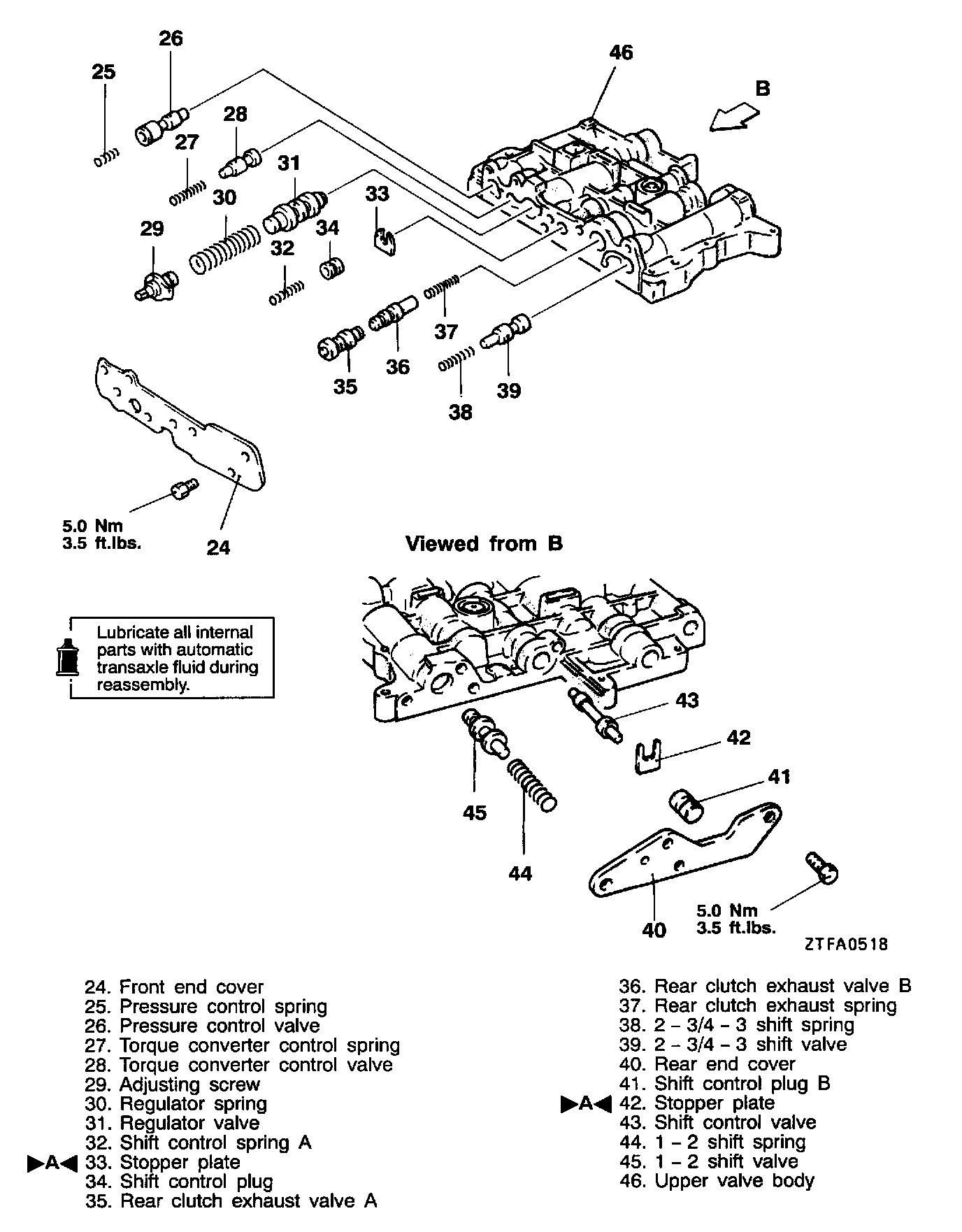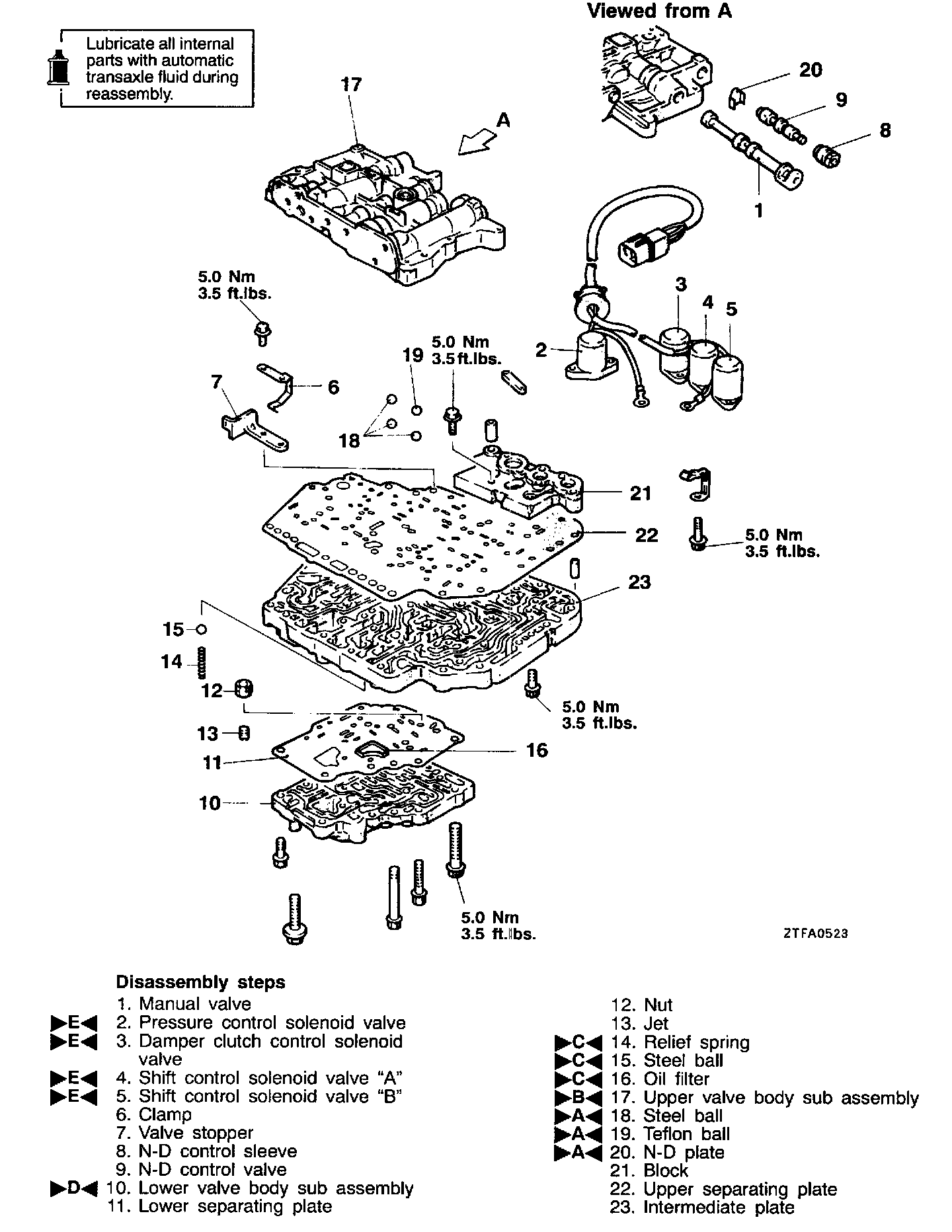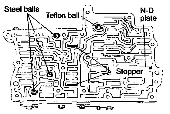 Install the stopper plates, Nm-D plate, teflon ball and steel balls in the upper valve body in the positions shown in the figure.