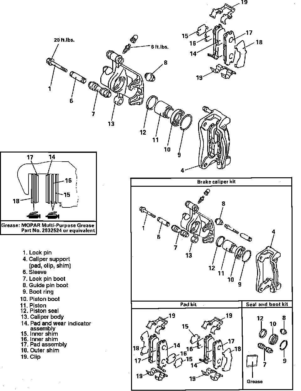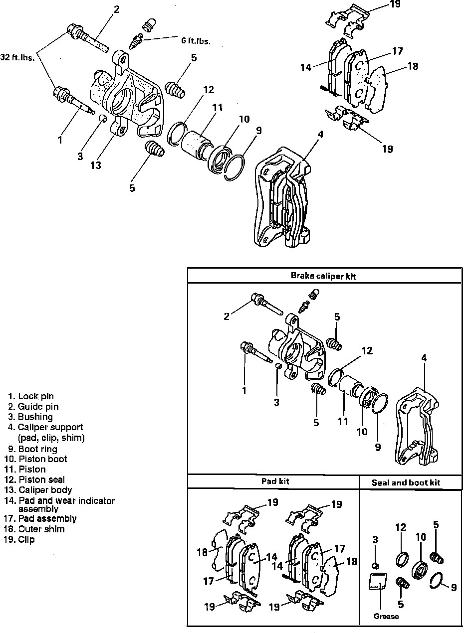 7. Install upper and lower pad clips, pad assemblies and inner and outer shims into support mounting.