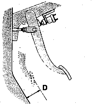 j. Start engine, then depress brake pedal with approximately 110 lbs. of force and measure clearance dimension "D" between brake pedal and floorboard. Clearance should be 3.1 inch or more.