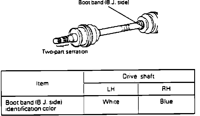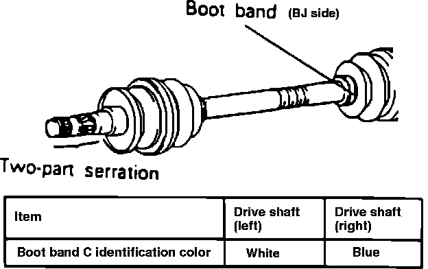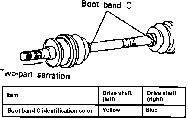 b. Driveshafts are of different length. Driveshafts can be distinguished from each other by identification color of boot band C.