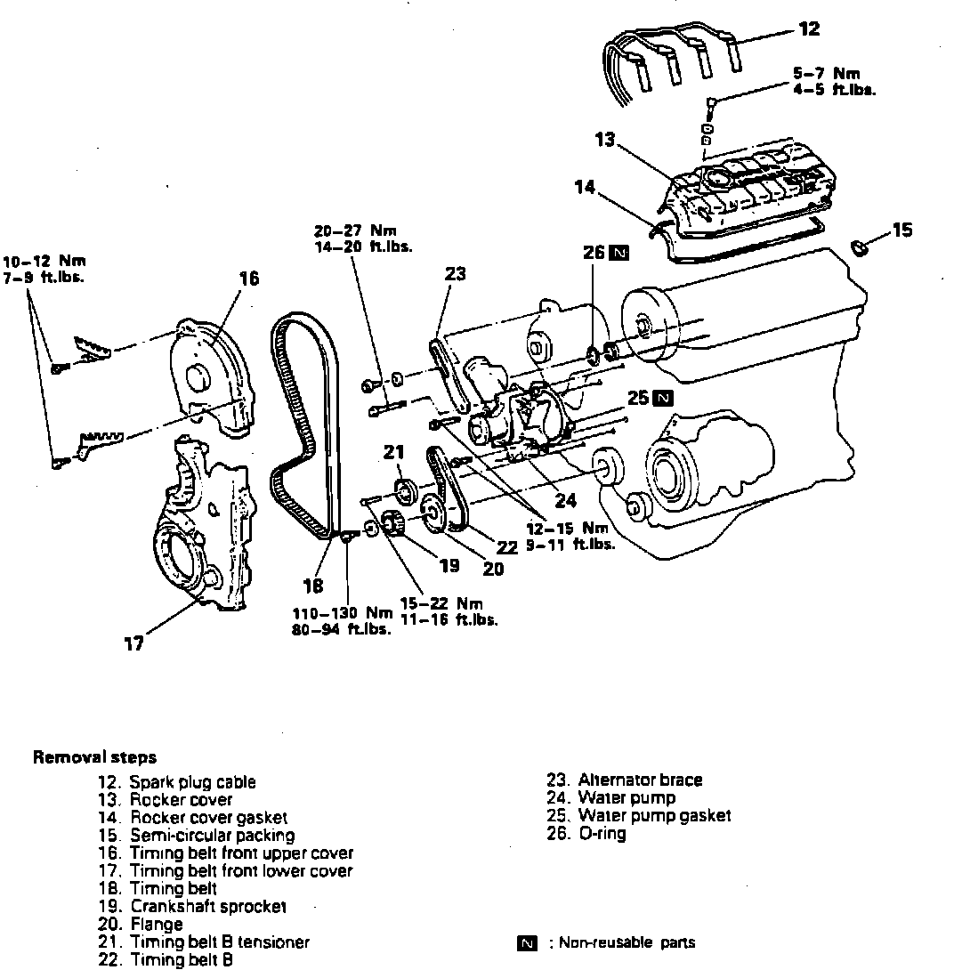 5. Remove rocker cover, timing belt covers, timing belt and timing belt B as outlined under "Timing Belt, Replace."