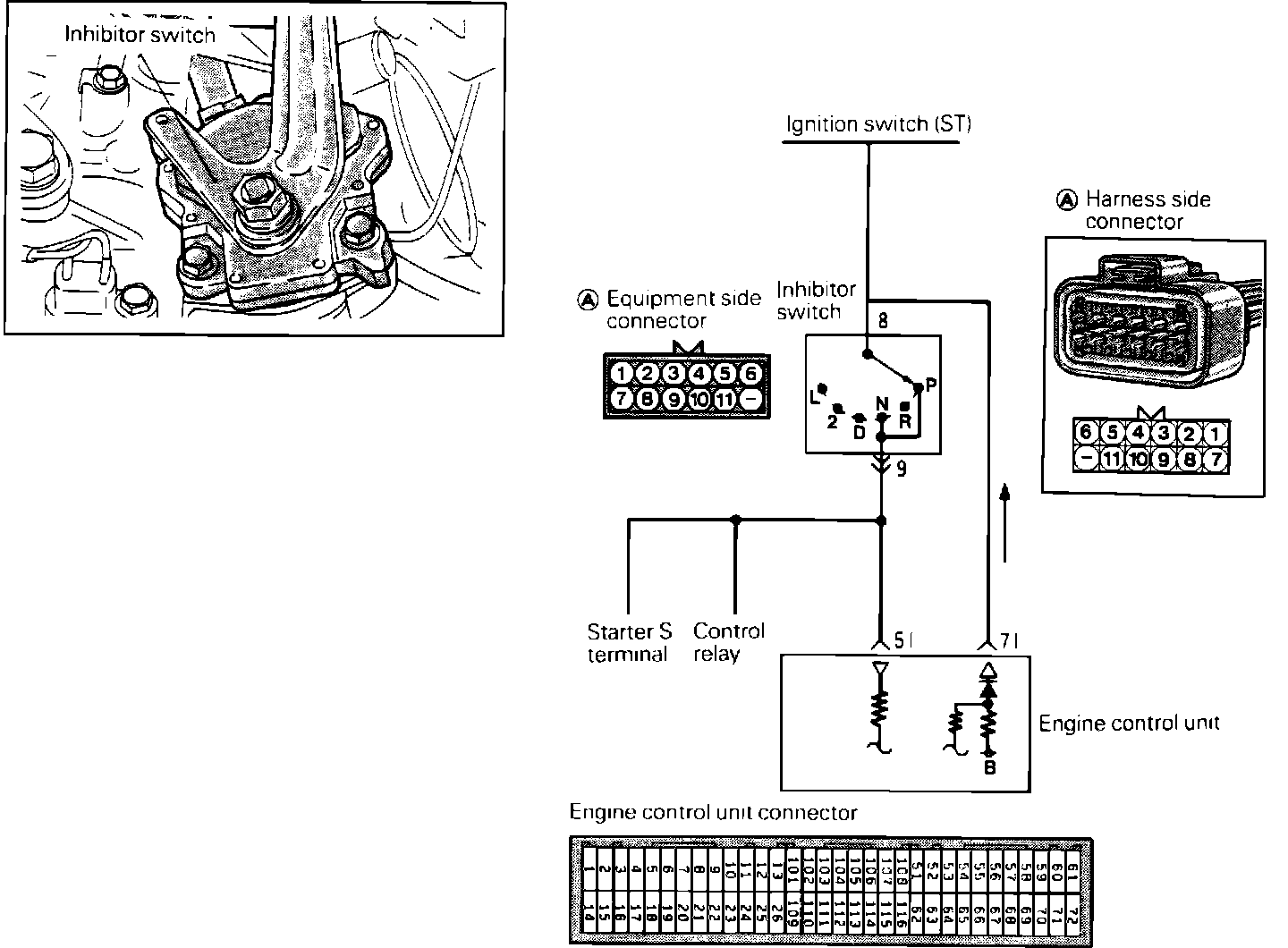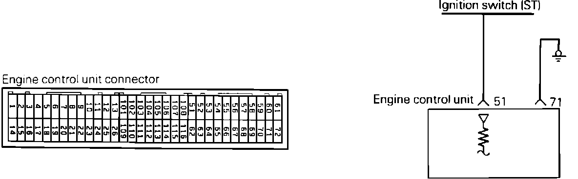 The ignition switch supplies "ON" and "START" information to the ECM to position the idle speed control components. The ignition switch "ON" signal is provided to the ECM through the control relay. Refer to the images for the "START" signal.