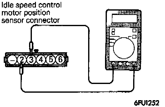 4. Connect DC 6V between terminals (1) and (2) of the idle speed control motor connector, and then measure the resistance between terminals (3) and (5) of the idle speed control motor position sensor connector when the idle speed control motor is activated (caused to expand and contract).