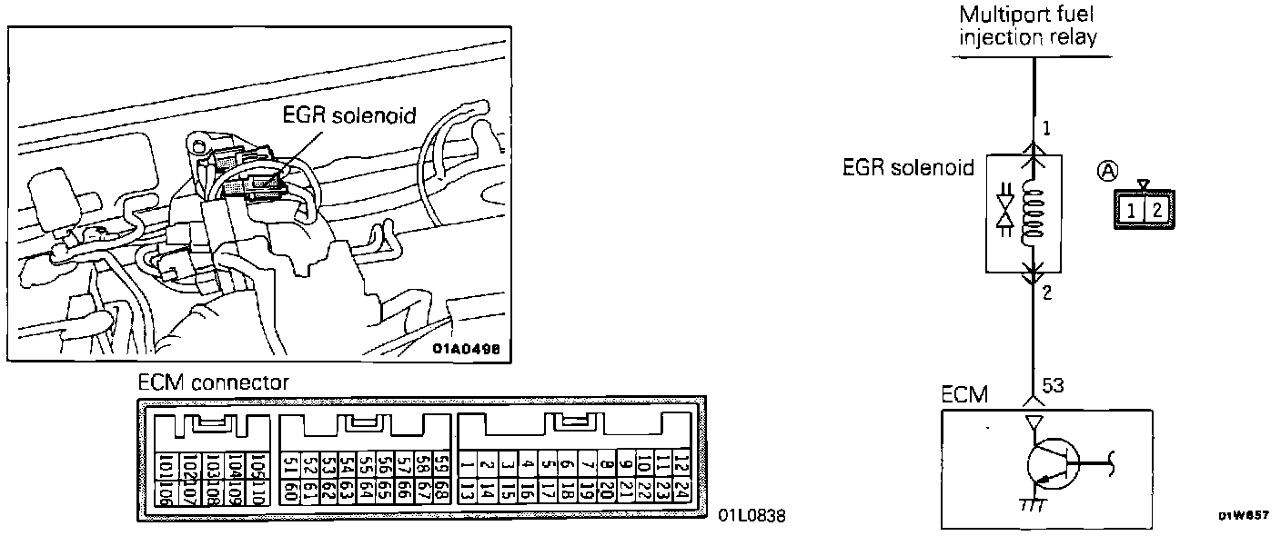 4. Using an ohmmeter, check for an open wire between the EGR Solenoid connector terminal 2 and the ECM connector terminal 53.