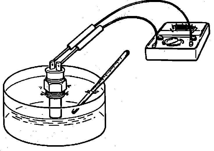 2. With the sensing portion of the Coolant Temperature Sensor immersed in hot water, check for continuity between the two terminals. The sensor should be held with its threaded housing 3 mm (1/8 in) away from the surface of the hot water.