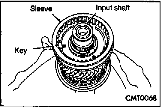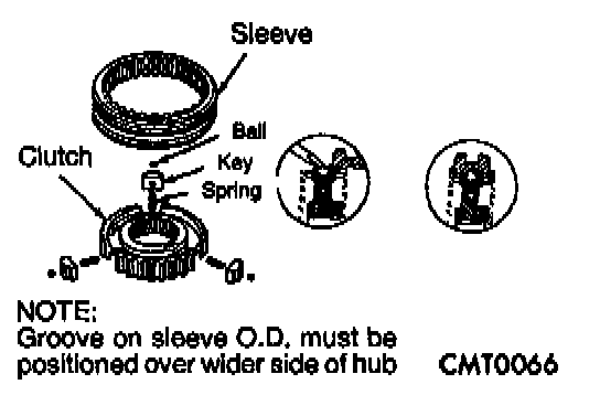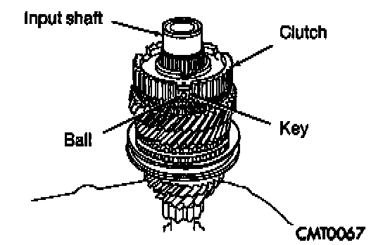 Place synchronizer in a clean shop towel and wrap. Press on inner hub. Carefully open up shop towel and remove springs, balls, keys, hub, and sleeve.