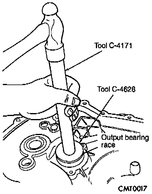2. Insert tool # C-4628 with C-4171 into output bearing race. Tap race into bore.