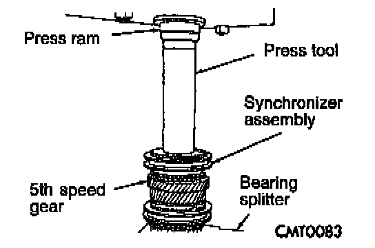 11. Using special tool # C-3717, install 5th speed gear and synchronizer. The 5th gear synchronizer hub has the letter "R" stamped on the top face of the hub. This designates that hub must be installed with the "R" facing upward.