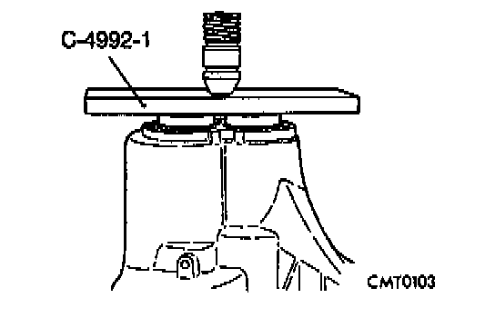 6. Apply a medium load to differential with Tool C-4995 and a T-Handle, in the downward direction. Roll differential assembly back and forth many times. This will settle the bearings. Zero dial indicator. To obtain end play readings, apply a medium load in the upward direction while rolling differential assembly back and forth. Record end play.