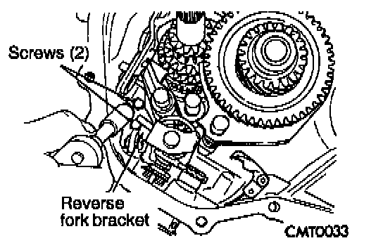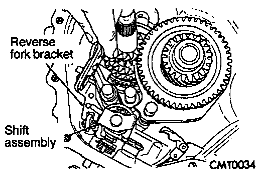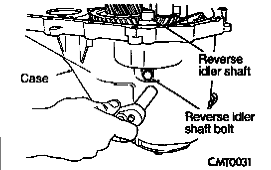 18. Install reverse idler gear and shaft. Install bolt into shaft Tighten bolt on shaft to 20 Nm (15 ft.lbs.) torque.