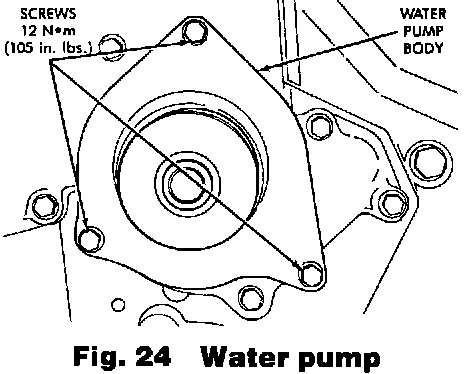 3. Remove water pump mounting bolts then the water pump, Fig. 24.