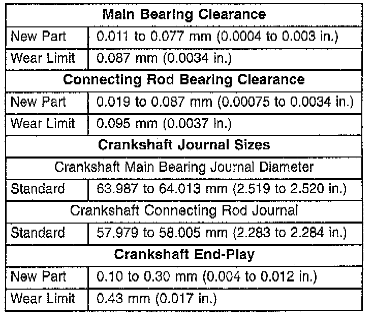 NOTE: The crankshaft journals should be checked for excessive wear, taper and scoring. Limits of taper or out-of-round on any crankshaft journals should be held to 0.025 mm (0.001 inch). Journal grinding should not exceed 0.305 mm (0.012 inch) under the standard journal diameter. DO NOT grind thrust faces of Number 2 main bearing. DO NOT nick crank pin or bearing fillets. After grinding, remove rough edges from crankshaft oil holes and clean out all passages.