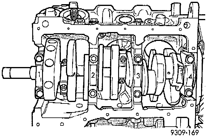 NOTE: Bearing caps are not interchangeable and should be marked at removal to insure correct assembly. Upper and lower bearing halves are NOT interchangeable. Lower main bearing halves of 1, 2, 3 and 4 are interchangeable. Upper main bearing halves of 1, 3 and 4 are interchangeable.