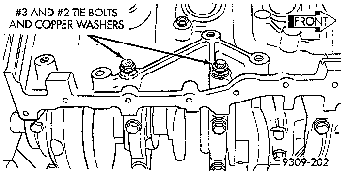 10. Tighten the #2 Thrust Bearing cap bolts to 41 Nm + 1/4 Turn (30 ft. lbs. + 1/4 Turn). Then tighten the #2 tie bolts to 54 Nm (40 ft. lbs.). Remove the holding tool.