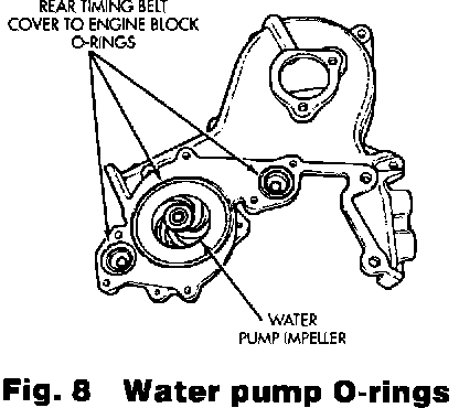 5. If right side timing belt cover is removed, there are O-rings located behind it for water pump passages, Fig. 8.
