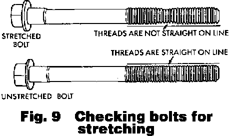 11. Check cylinder head bolts for necking by holding a scale or straightedge against threads. If all threads do not contact the scale, bolts should be replaced, Fig. 9.