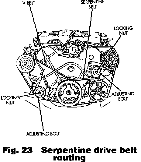The drive belt is provided with an adjustable tensioner pulley on the timing belt cover, Fig. 23, to maintain proper belt tension. To remove or install belt, release tension by loosening the tensioner pulley nut and adjustment bolt. Reverse procedure to tighten belt to specified tension.