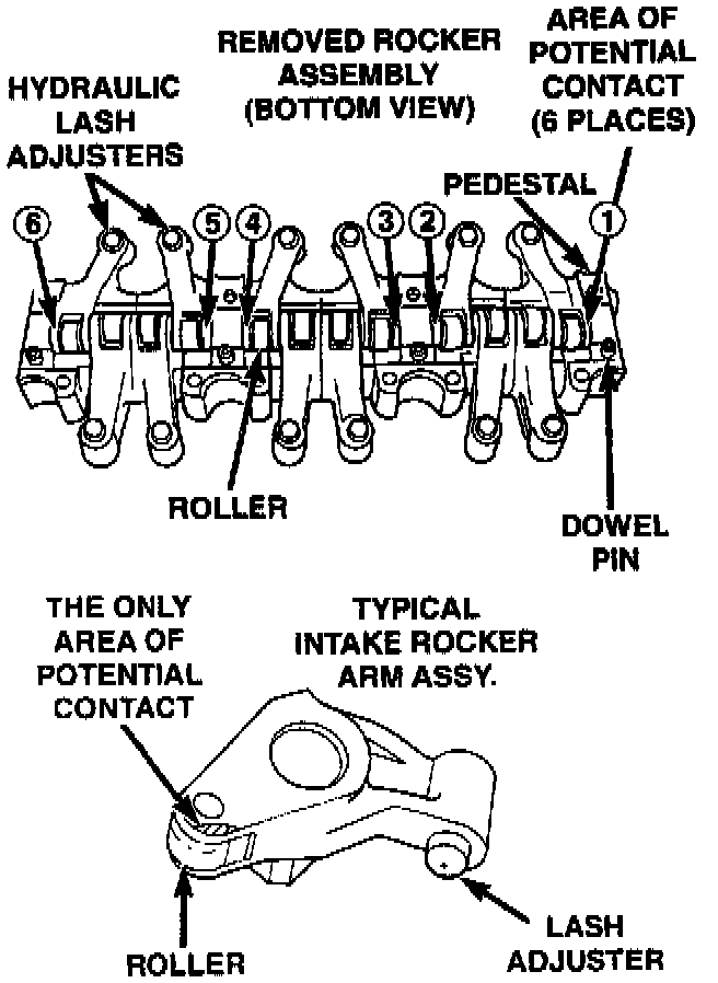 7. Inspect the bottom side of the intake rocker arms for evidence of contact with the camshaft at the side that is closest to the camshaft bearing journal on each of the rockers as shown. Contact will appear as freshly shaved, bright aluminum rather than the oil-stained, dull-looking machined surface normally present. Contact may occur to more than one rocker in a bank.