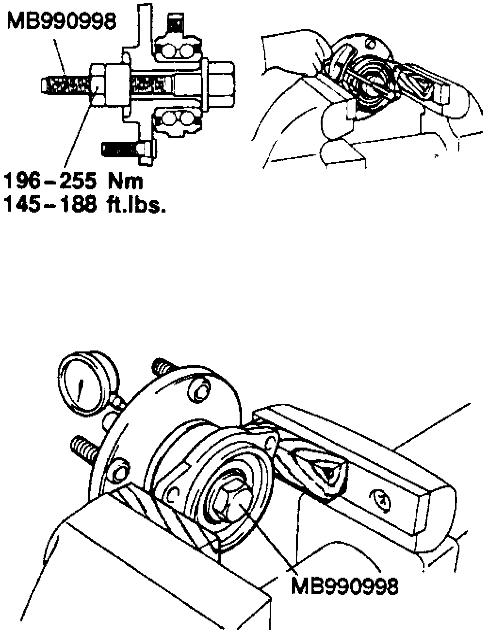 c. If endplay exceeds 0.002 inch, use special wheel bearing installer tool No. MB990998, or equivalent, to tighten bearing. Torque special tool to 145-188 ft. lbs.