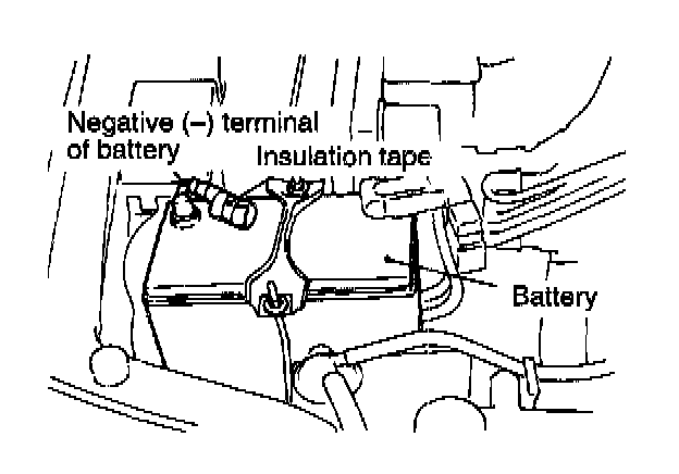 After the ignition switch has been placed at the LOCK position and the negative (-) terminal of the battery has been disconnected, wait for more than 60 seconds before starting work. Wind a tape around the disconnected (-) terminal for insulation.