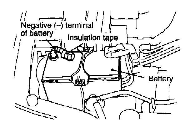 After the ignition switch has been placed at the LOCK position and the negative (-) terminal of the battery has been disconnected, wait for more than 60 seconds before starting work. Wind a tape around the disconnected (-) terminal for insulation.