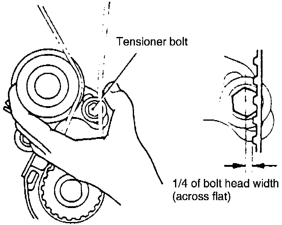 a. Loosen tensioner bolts to allow tensioner to bear against belt, then tighten adjusting bolt and pivot bolt. Tighten adjusting bolt first to prevent tensioner from rotating away from belt.