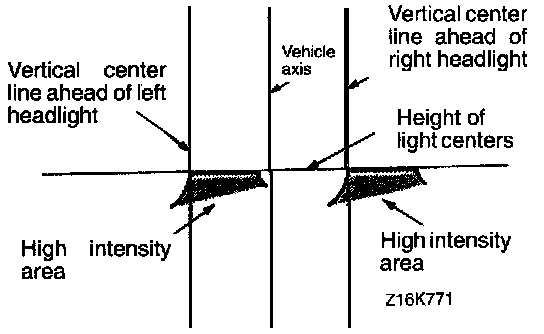 1. A properly aimed lower beam will appear on the aiming screen 7.6 M (25 Feet) in front of the vehicle. The shaded area as shown in the illustration indicates high intensity zone.