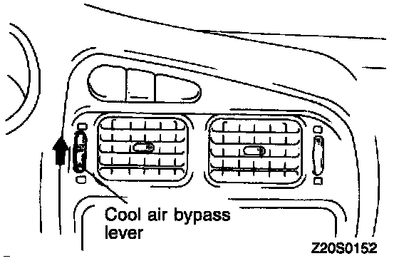 2. Turn the cool air bypass lever of the air outlet center panel assembly fully upward (in the direction of the arrow).
