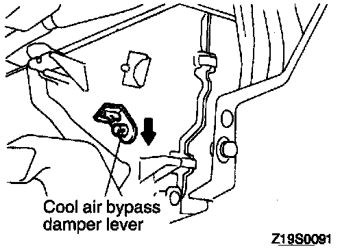 3. Turn the cool air bypass damper lever at the heater unit side fully downward (in the direction of the arrow), and install the cool air bypass lever cable.