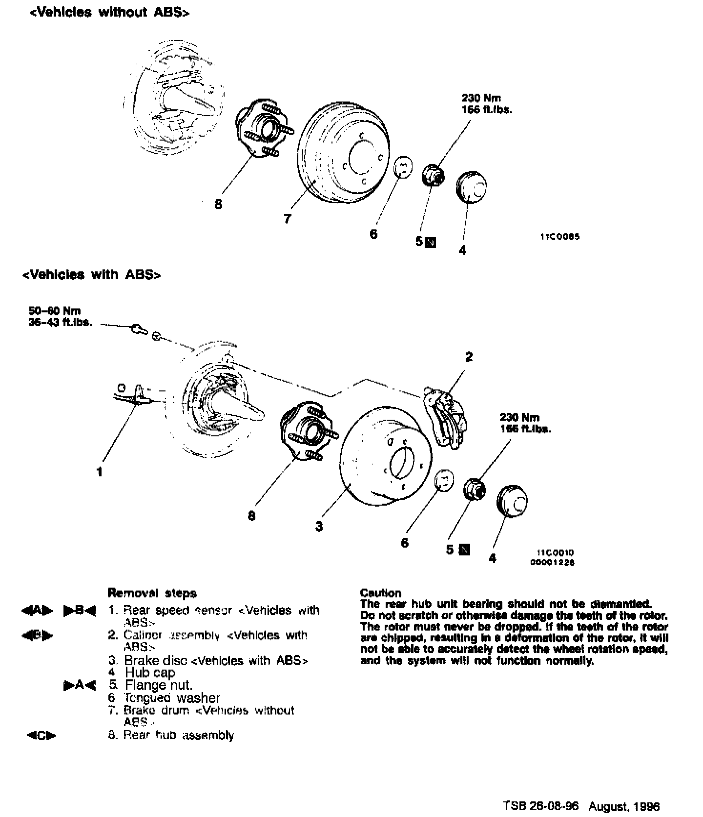 b. On models with ABS, adjust speed sensor by placing a feeler gauge speed sensors pole piece and rotors toothed surface. Gap should be between 0.008-0.028 inches, then tighten speed sensor.