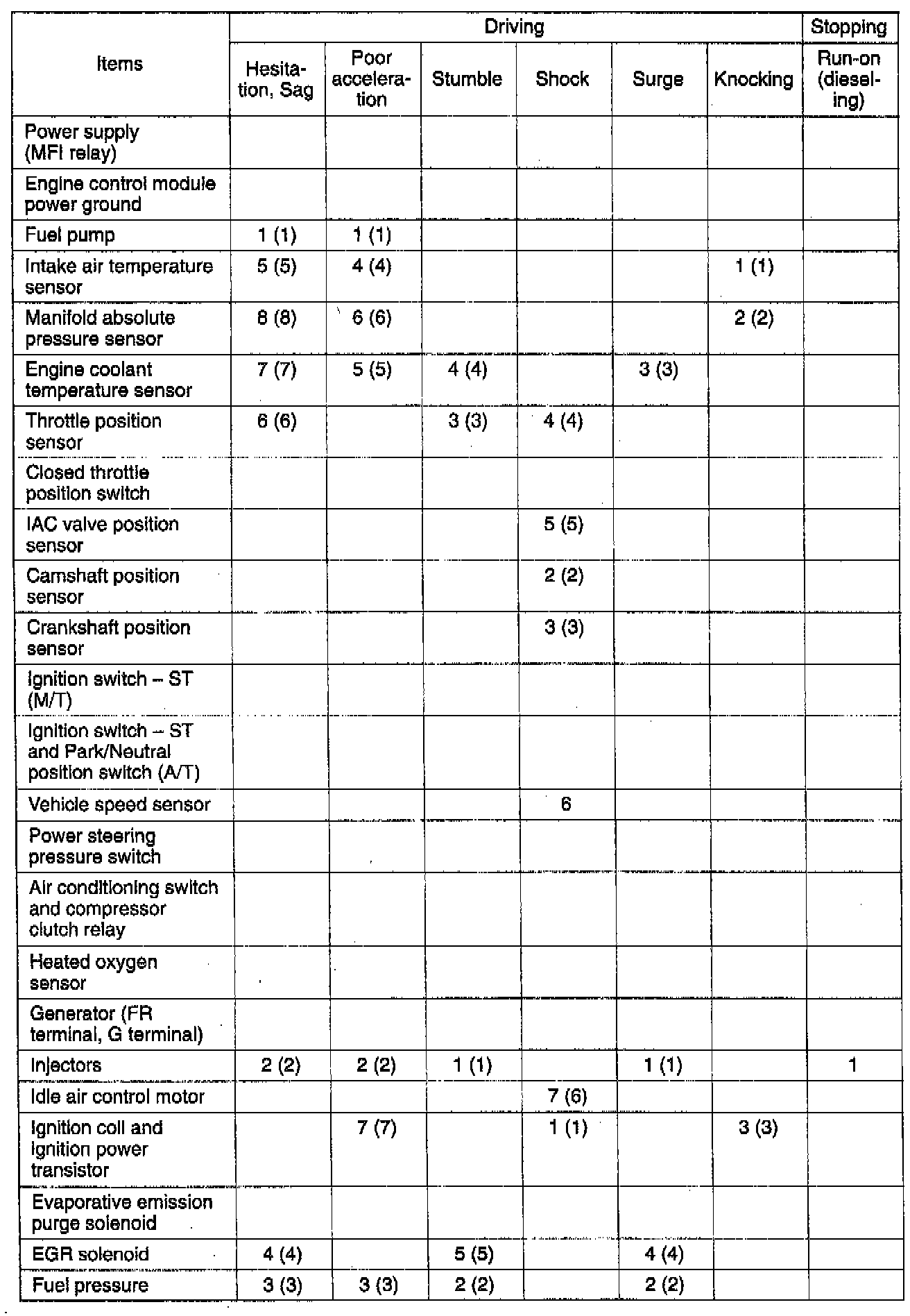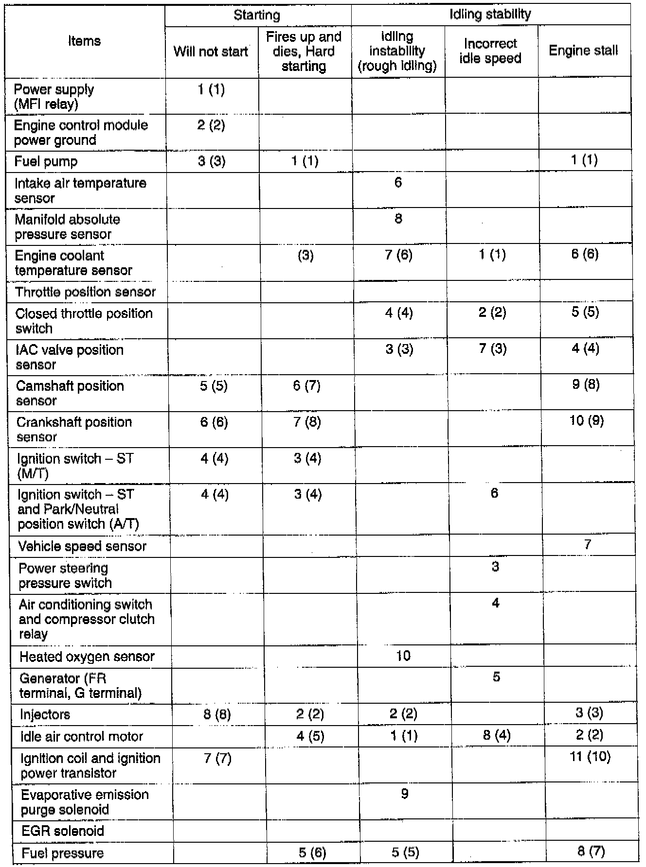 The numbers in the table indicate the check order. Numbers within brackets () indicate cold engine, without brackets indicates a warm engine.