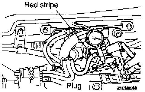 1. Disconnect the vacuum hose (red stripes) from the throttle body and connect it to a hand vacuum pump.