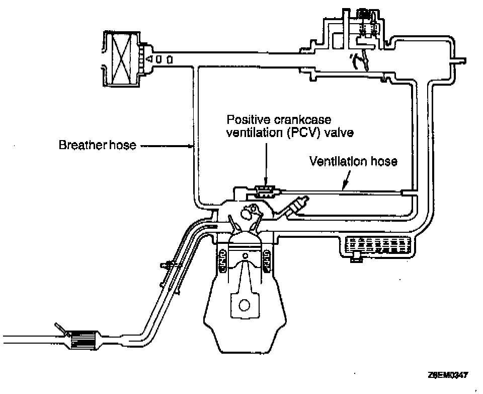 Fresh air is sent from the air cleaner into the crankcase through the breather hose to be mixed with the blowby gases inside the crankcase. The blowby gas inside the crankcase is drawn into the intake manifold through the positive crankcase ventilation valve.