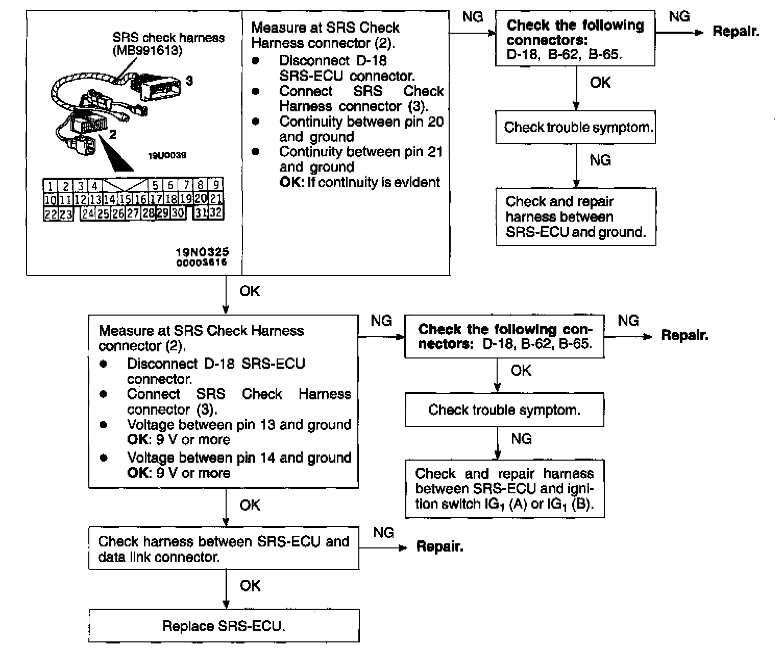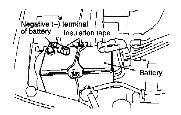 1. After the ignition switch has been placed at the LOCK position and the negative (-) terminal of the battery has been disconnected, wait for more than 60 seconds before starting work. Wind a tape around the disconnected (-) terminal for insulation.