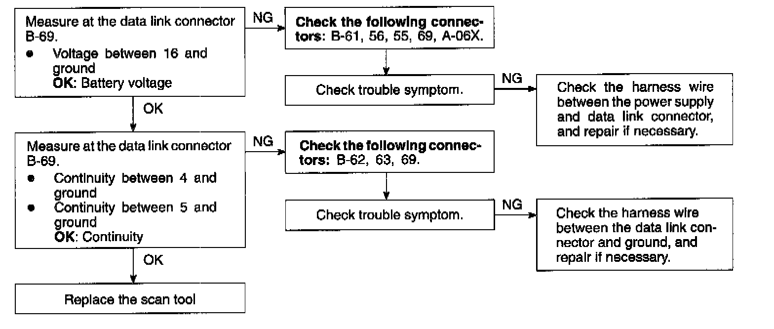 An open circuit in the on-board diagnostic output circuit or power supply circuit (including the ground) is suspected.