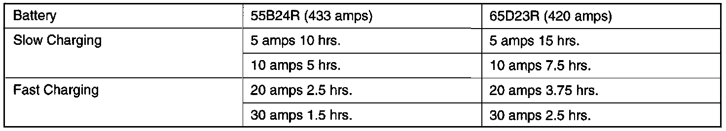 CAUTION: When batteries are being charged, an explosive gas forms beneath the cover of each cell. Do not smoke near batteries on charge or which have recently been charged. Do not break live circuits at the terminals of the batteries on charge. A spark will occur where the live circuit is broken. Keep all open flames away from the battery. Battery electrolyte temperature may temporarily be allowed to rise to 55°C (131°F). Increase of electrolyte temperature above 55°C (131°F) is harmful to the battery, causing deformation of battery cell, decrease in life of battery, etc.Charge Rate Chart: