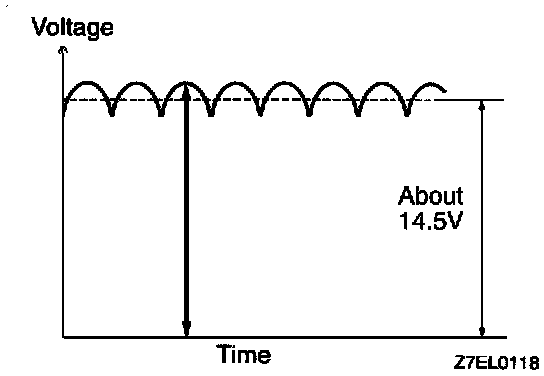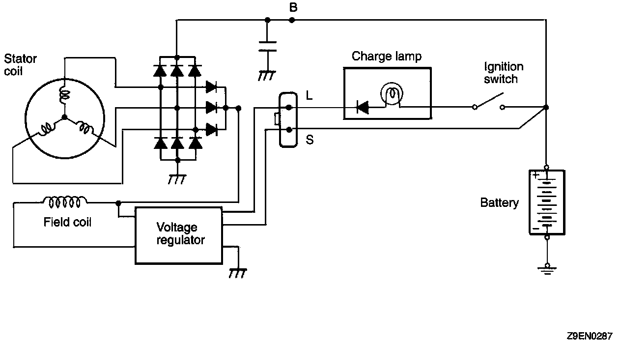 The generator output voltage rises as the field current increases and it falls as the field current decreases. When the battery voltage (generator terminal voltage) reaches a regulated voltage of Approx. 14.4 V, the field current is cut off. When the battery voltage drops below the regulated voltage, the voltage regulator regulates the output voltage to a constant level by controlling the field current.