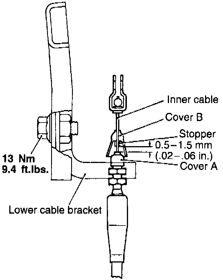 3. Move cable lower mounting bracket until clearance between nipple and top of cable cover (A) is 0.02-0.06 inch, then torque cable lower mounting bracket bolt to 9.4 ft. lbs.