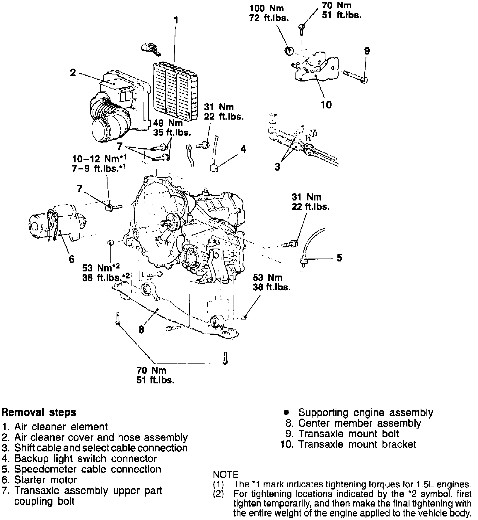 1. Remove transaxle in numbered sequence shown noting following: