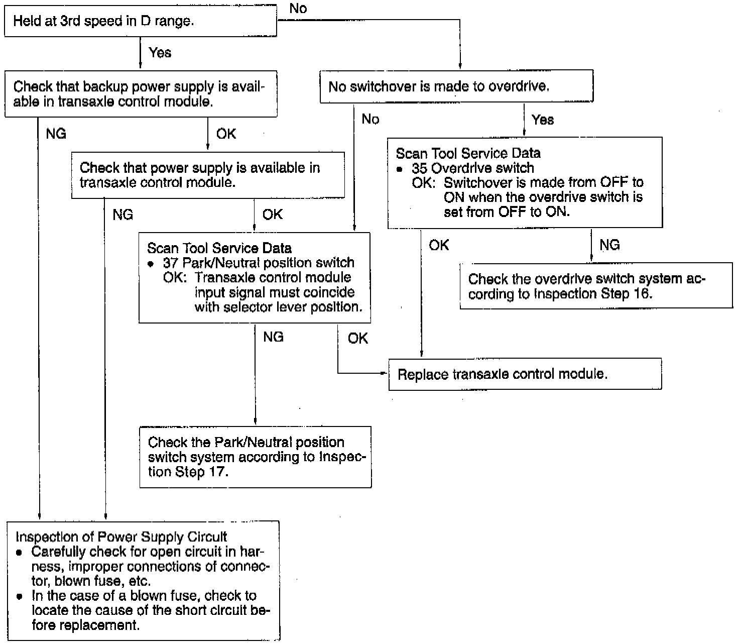 No shift is made during operation. No fail safe code is output. In this case, a defective overdrive switch, position Park/Neutral switch, etc. are suspected.