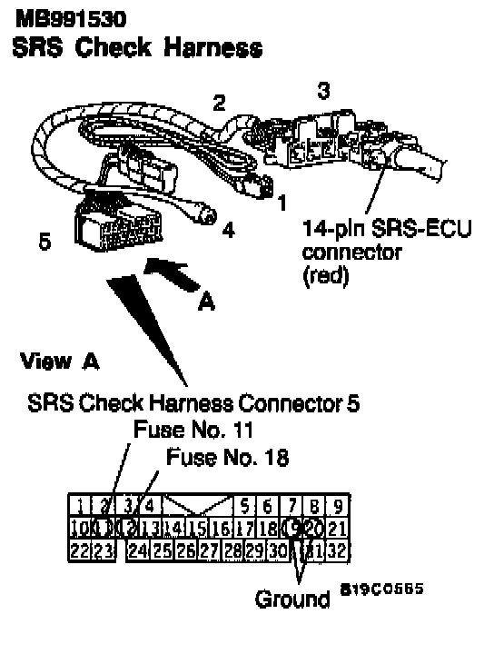 5. Connect the now disconnected red harness-side SRS ECU connector (14-pin) to the connector 3 of the SRS Check Harness.
