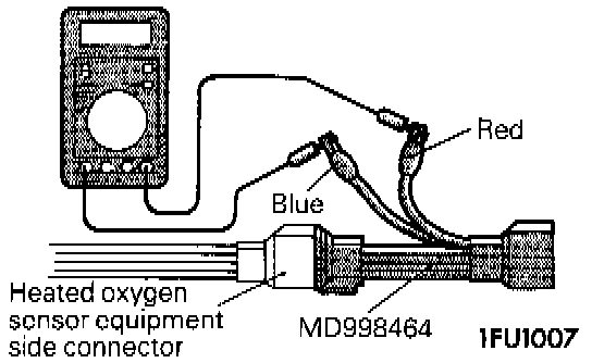 2. Make sure that there is continuity [Approx. 12 Ohms at 20°C (68°F)] between terminals 2 (red clip of the special tool) and terminal 4 (blue clip) on the heated oxygen sensor (front) connector.